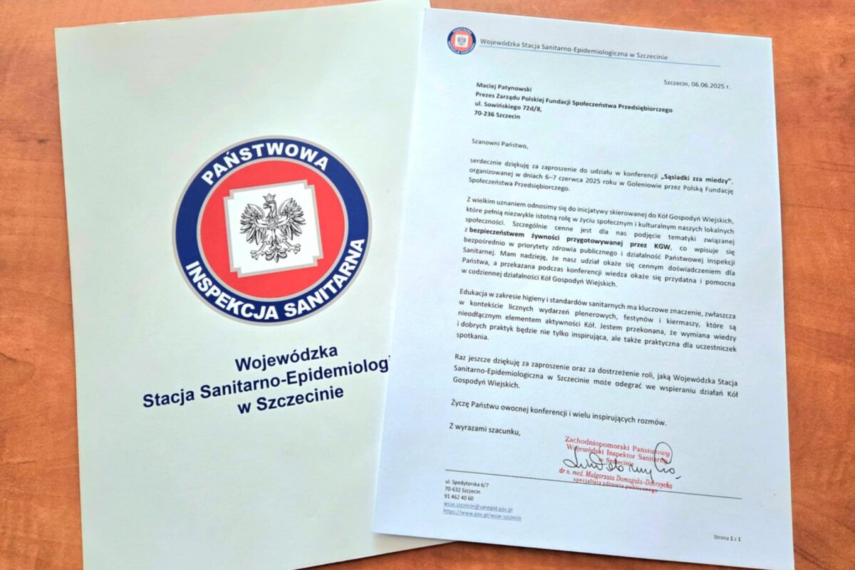 Z ogromną radością dzielimy się ważnym głosem wsparcia, jaki dotarł do nas po konferencji „Sąsiadki zza miedzy”, zorganizowanej w dniach 6–7 czerwca 2025 roku w Goleniowie. W liście skierowanym do naszej Fundacji, dr n. med. Małgorzata Domagała-Dobrzycka, Zachodniopomorski Państwowy Wojewódzki Inspektor Sanitarny, podkreśliła wagę i wartość inicjatyw kierowanych do Kół Gospodyń Wiejskich: