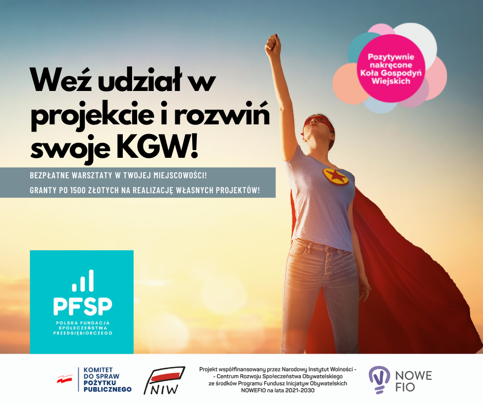 Projekt Koła Gospodyń Wiejskich – pozytywnie nakręcone to największe w Polsce przedsięwzięcie dotyczące wsparcia dla Kół Gospodyń Wiejskich. Realizujemy je dzięki dofinansowaniu ze środków Narodowego Instytutu Wolności – Centrum Rozwoju Społeczeństwa Obywatelskiego ze środków #NOWEFIO, Komitet do spraw Pożytku Publicznego.